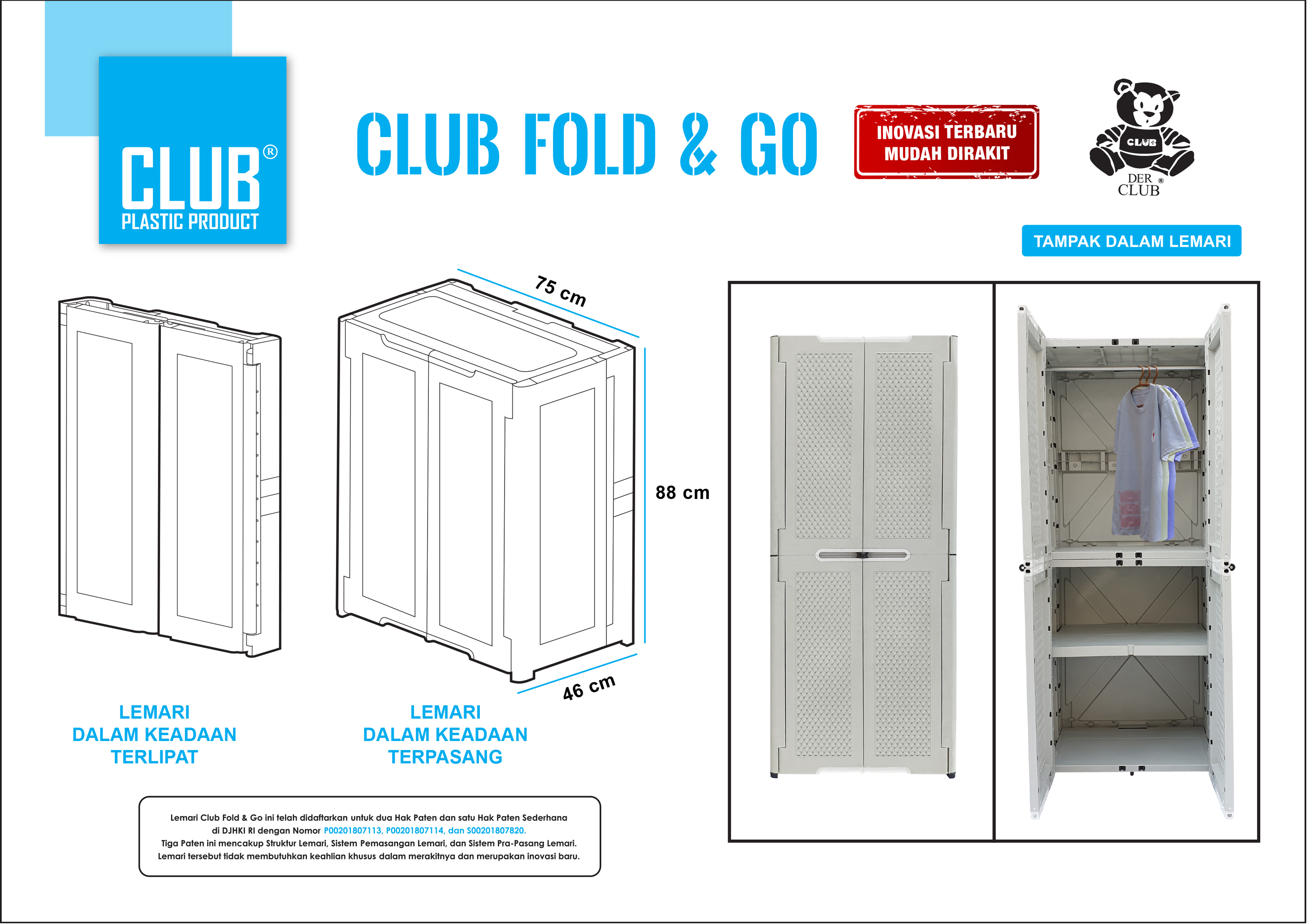 Lemari Club Fold & Go ini telah didaftarkan untuk dua Hak Paten dan satu Hak Paten Sederhana di DJHKI RI dengan nomor P00201807113, P00201807114, dan S00201807820. Tiga Paten ini mencakup Struktur Lemari, Sistem Pemasangann Lemari, dan Sistem Pra-Pasang Lemari. Lemari tersebut tidak membutuhkan keahlian khusus dalam merakitnya dan merupakan inovasi baru.