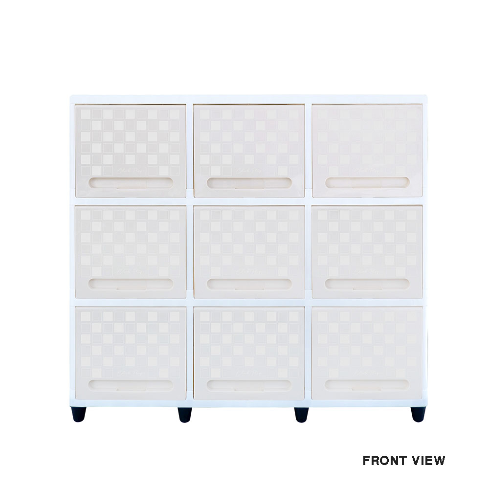 CLUB Triple Flip hadir dengan varian Square, desain minimalis dengan dinding dan nampan berwarna putih polos dan pintu lemari berwarna cream cerah bercorak kotak-kotak untuk menambah estetika hunian anda.