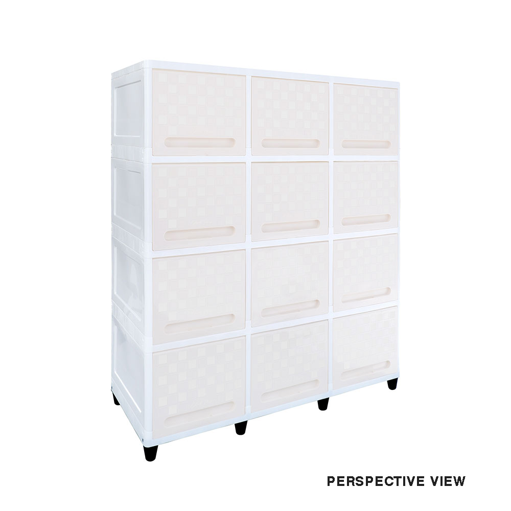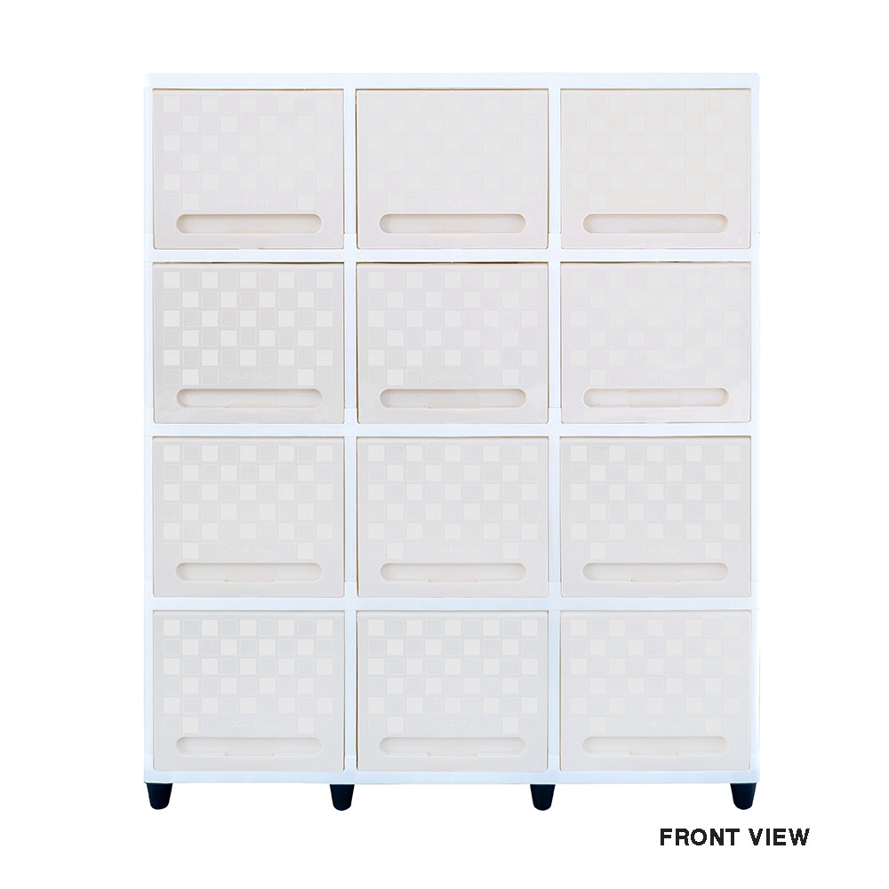 CLUB Triple Flip hadir dengan varian Square, desain minimalis dengan dinding dan nampan berwarna putih polos dan pintu lemari berwarna cream cerah bercorak kotak-kotak untuk menambah estetika hunian anda.