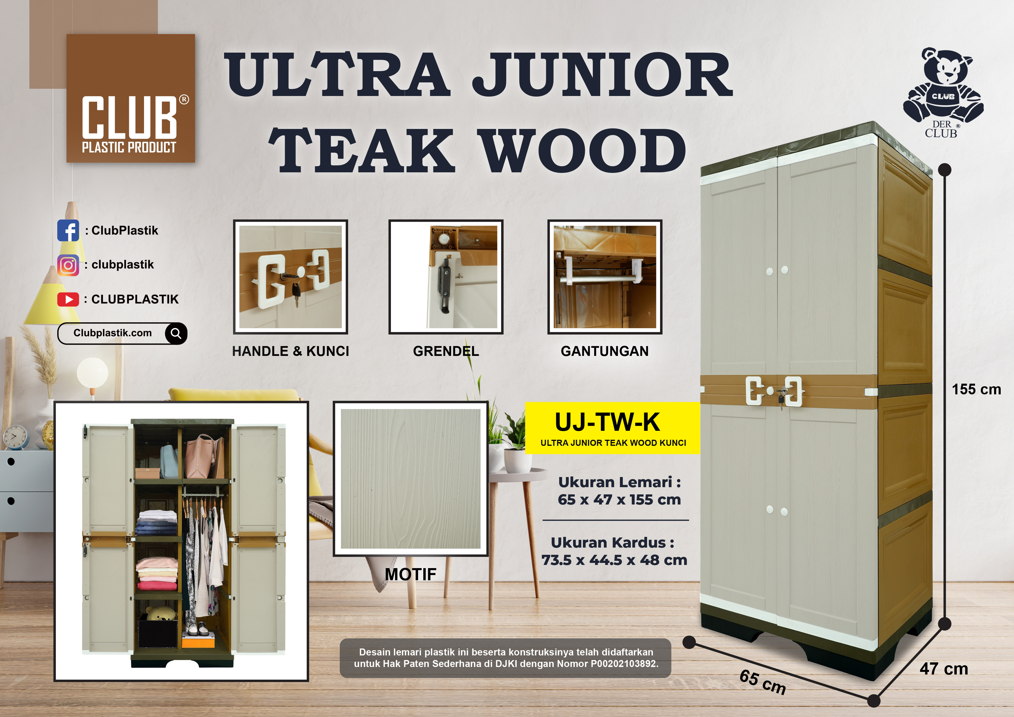 CLUB Ultra Junior Cabinet hadir dengan desain mewah minimalis dan dilengkapi dengan kunci serta grendel untuk menambah keamanan. Dilengkapi juga dengan gantungan/hanger baju yang sangat kuat dan tidak mudah patah. Didesain dengan berbagai motif menarik dan dilengkapi dengan kunci untuk menambah keamanan barang yang disimpan.