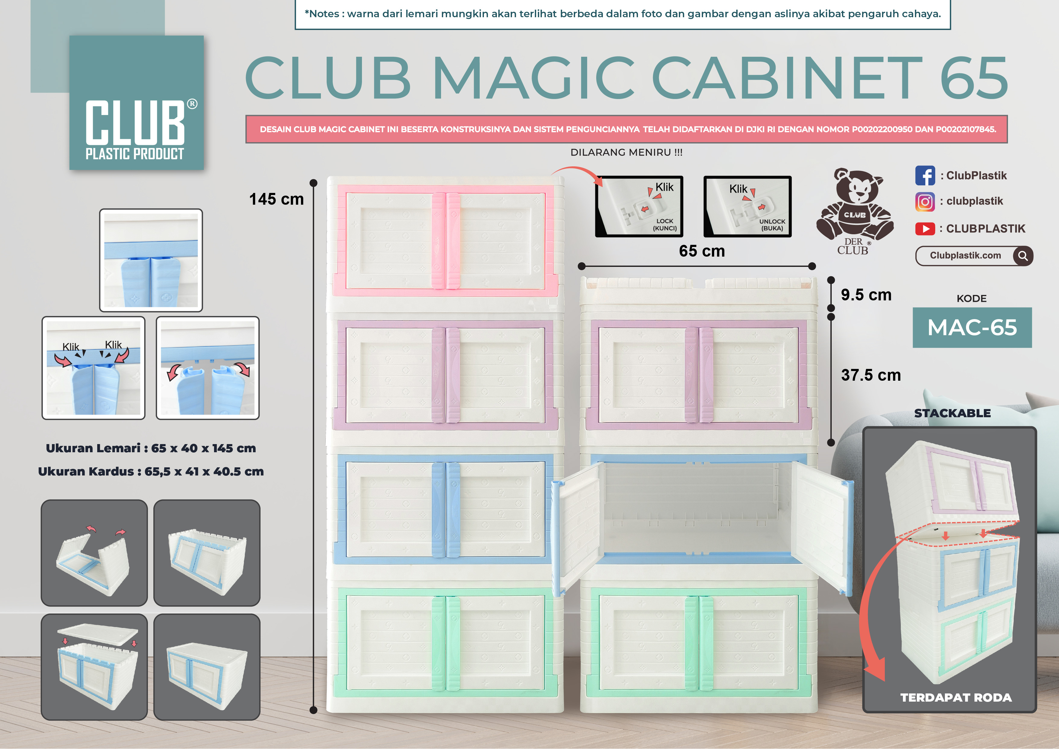 CLUB Magic Cabinet merupakan lemari portable yang hadir dengan sangat praktis serta multifungsi. CLUB Magic Cabinet dapat dilipat dan dikunci sehingga mudah untuk disimpan saat sedang tidak digunakan. Bersifat stackable (dapat ditumpuk) dan terdapat juga roda yang kuat di bagian bawahnya agar mudah dipindah-pindahkan. Diproduksi dengan bahan plastik berkualitas premium, CLUB Magic Cabinet dijamin tidak mudah rusak dan pecah.