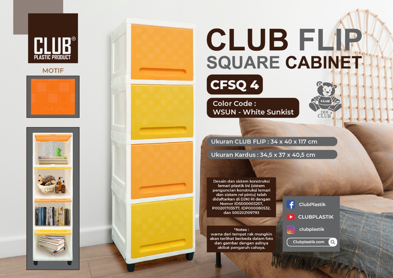 Berfungsi sangat baik untuk menyimpan barang-barang kesayangan anda, seperti pakaian, perlengkapan dapur, buku, mainan anak, dan lain-lain sesuai kebutuhan anda. Dengan ukuran yang ringkas dan compact, CLUB Flip sangatlah cocok untuk ditempatkan di rumah, apartemen, maupun kosan anda.