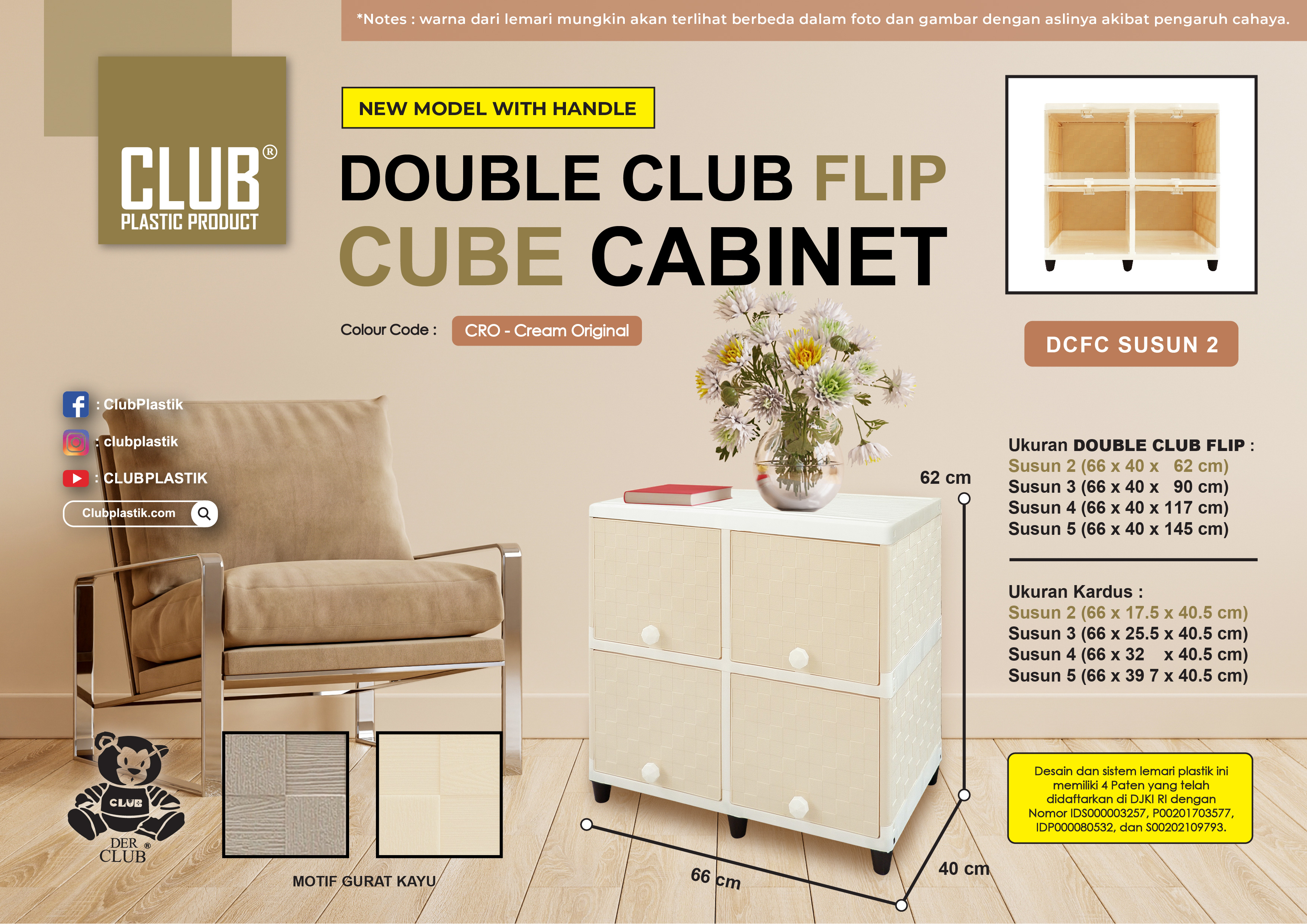 Berfungsi sangat baik untuk menyimpan barang-barang kesayangan anda, seperti pakaian, perlengkapan dapur, buku, mainan anak, dan lain-lain sesuai kebutuhan anda. Dengan ukuran yang ringkas dan compact, CLUB Flip sangatlah cocok untuk ditempatkan di rumah, apartemen, maupun kosan anda.