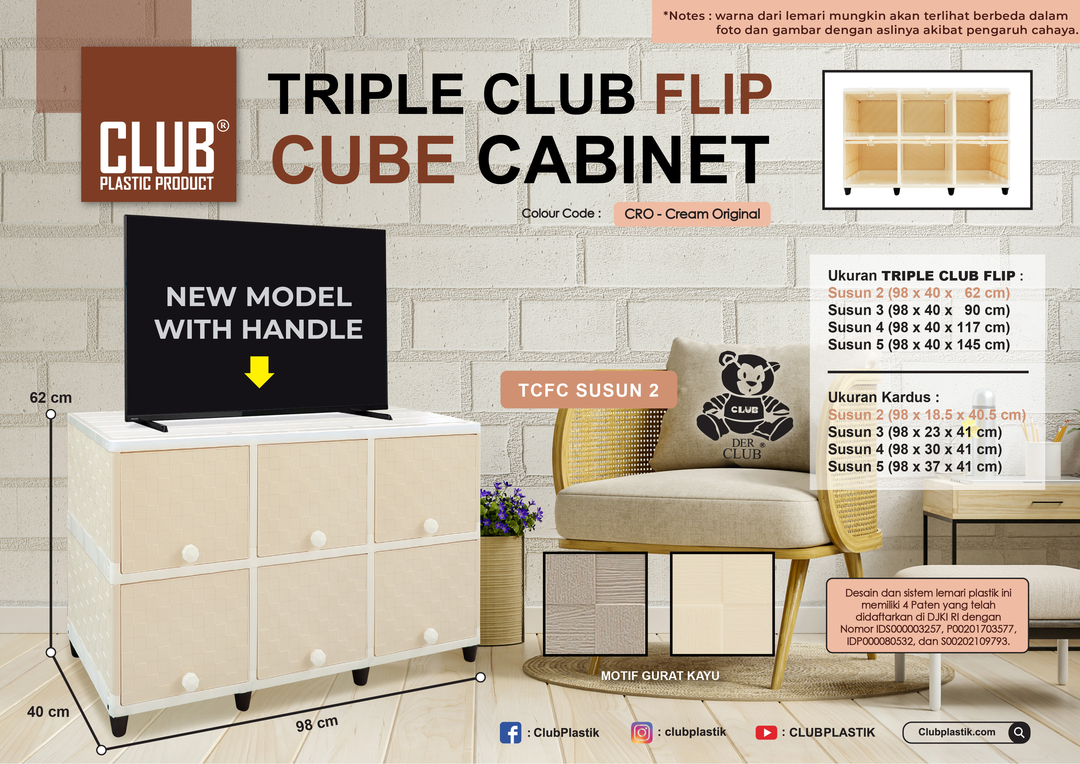 Berfungsi sangat baik untuk menyimpan barang-barang kesayangan anda, seperti pakaian, perlengkapan dapur, buku, mainan anak, dan lain-lain sesuai kebutuhan anda. Dengan ukuran yang ringkas dan compact, CLUB Flip sangatlah cocok untuk ditempatkan di rumah, apartemen, maupun kosan anda.