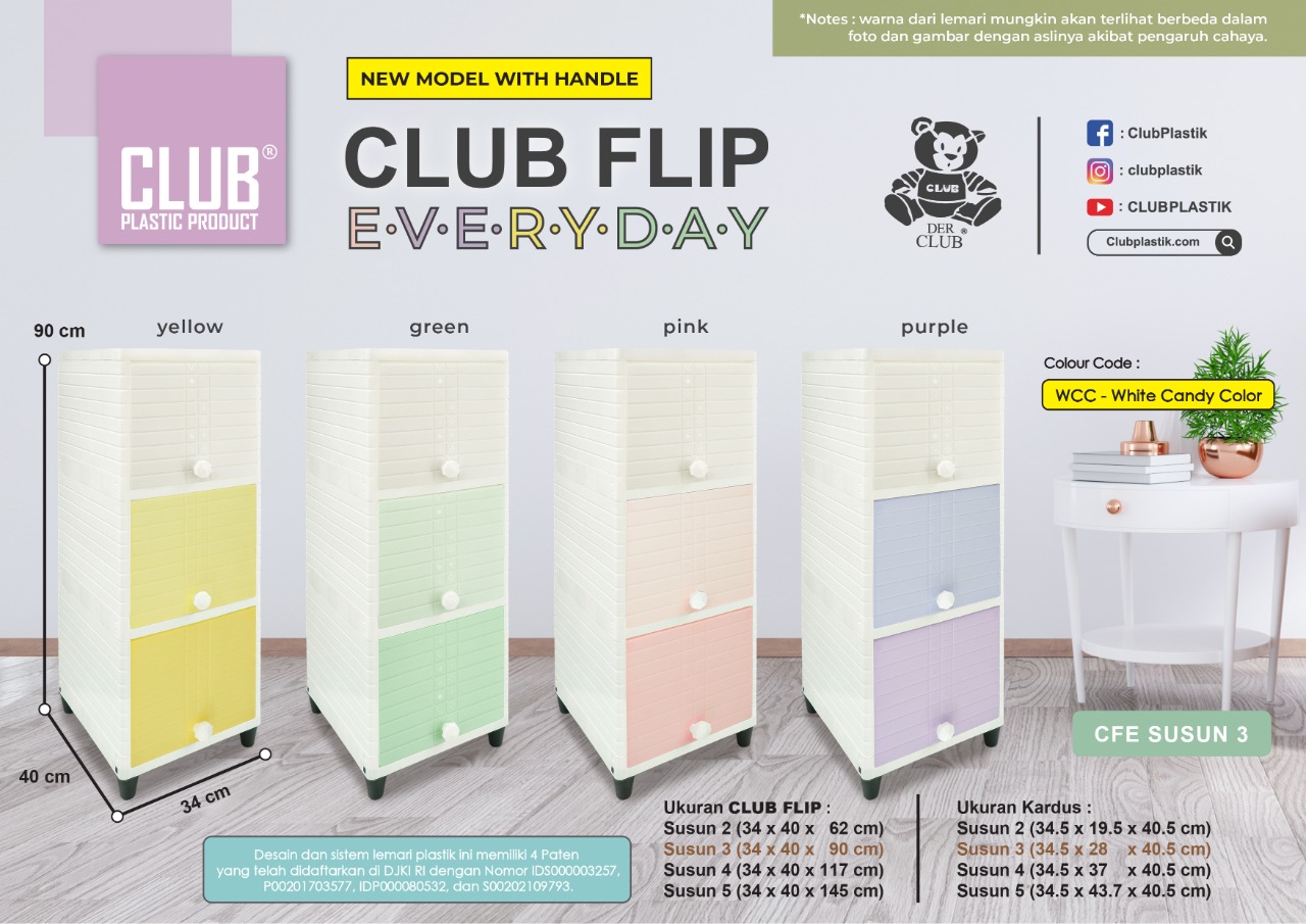 Berfungsi sangat baik untuk menyimpan barang-barang kesayangan anda, seperti pakaian, perlengkapan dapur, buku, mainan anak, dan lain-lain sesuai kebutuhan anda. Dengan ukuran yang ringkas dan compact, CLUB Flip sangatlah cocok untuk ditempatkan di rumah, apartemen, maupun kosan anda.