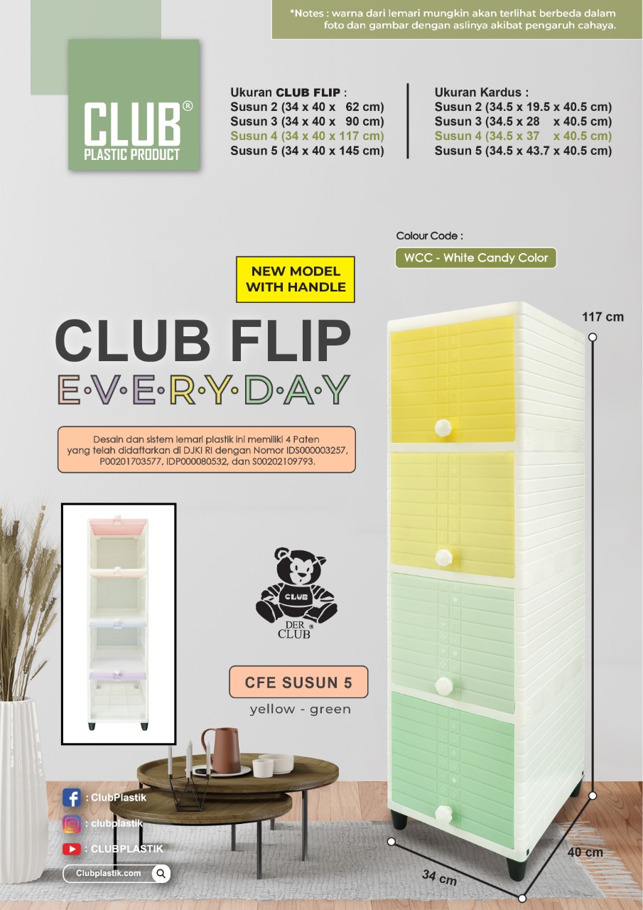 Berfungsi sangat baik untuk menyimpan barang-barang kesayangan anda, seperti pakaian, perlengkapan dapur, buku, mainan anak, dan lain-lain sesuai kebutuhan anda. Dengan ukuran yang ringkas dan compact, CLUB Flip sangatlah cocok untuk ditempatkan di rumah, apartemen, maupun kosan anda.
