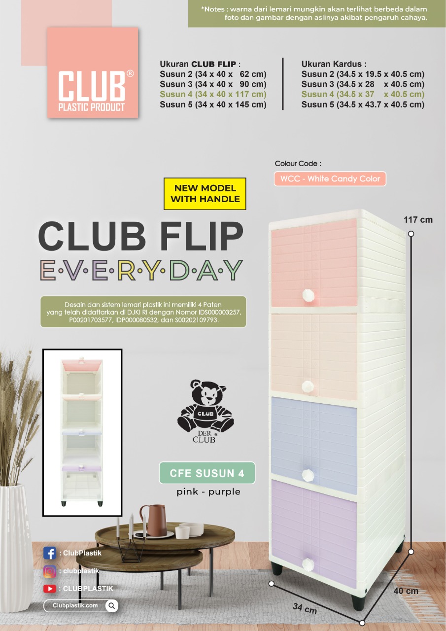 Berfungsi sangat baik untuk menyimpan barang-barang kesayangan anda, seperti pakaian, perlengkapan dapur, buku, mainan anak, dan lain-lain sesuai kebutuhan anda. Dengan ukuran yang ringkas dan compact, CLUB Flip sangatlah cocok untuk ditempatkan di rumah, apartemen, maupun kosan anda.