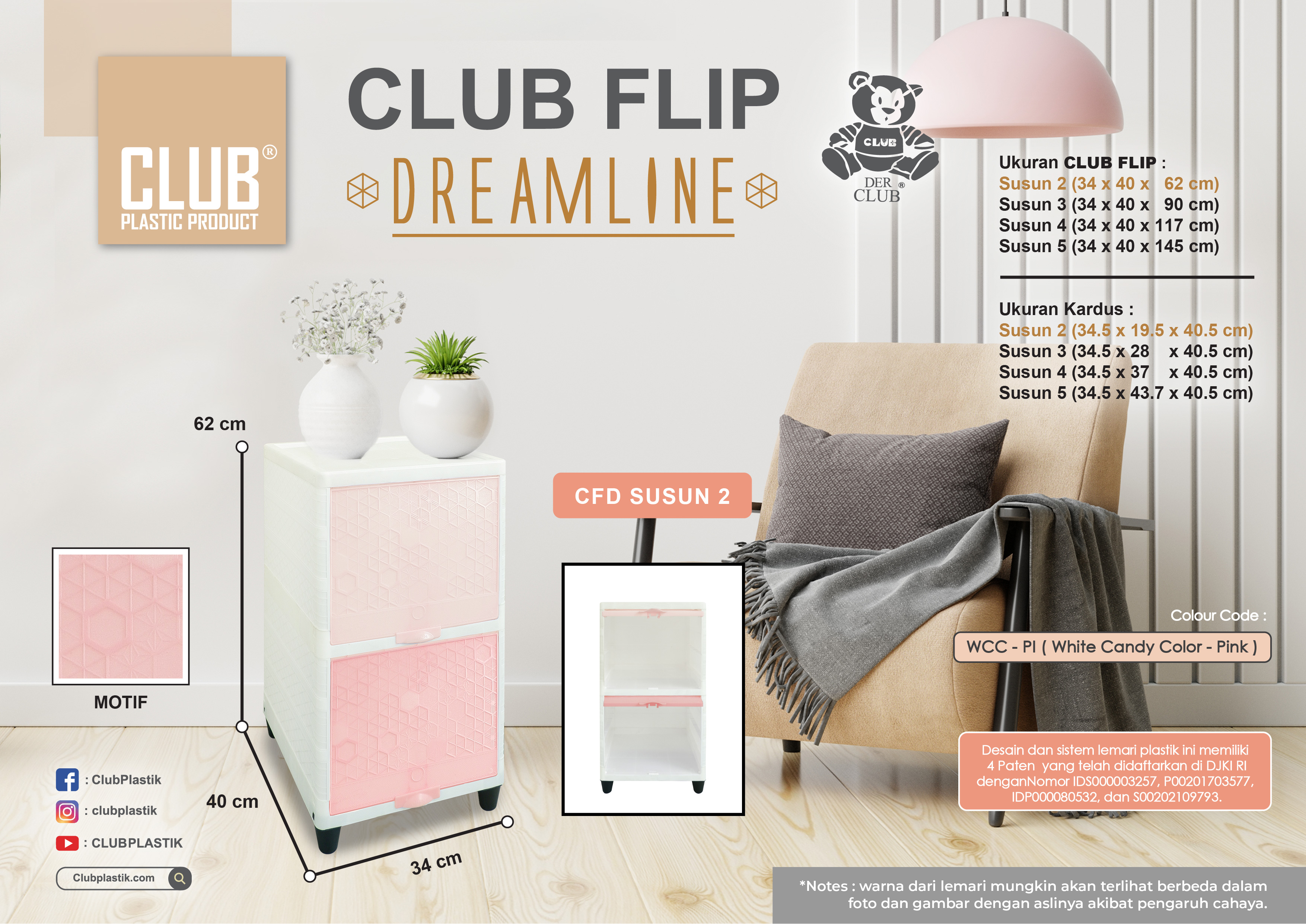 Berfungsi sangat baik untuk menyimpan barang-barang kesayangan anda, seperti pakaian, perlengkapan dapur, buku, mainan anak, dan lain-lain sesuai kebutuhan anda. Dengan ukuran yang ringkas dan compact, CLUB Flip sangatlah cocok untuk ditempatkan di rumah, apartemen, maupun kosan anda.