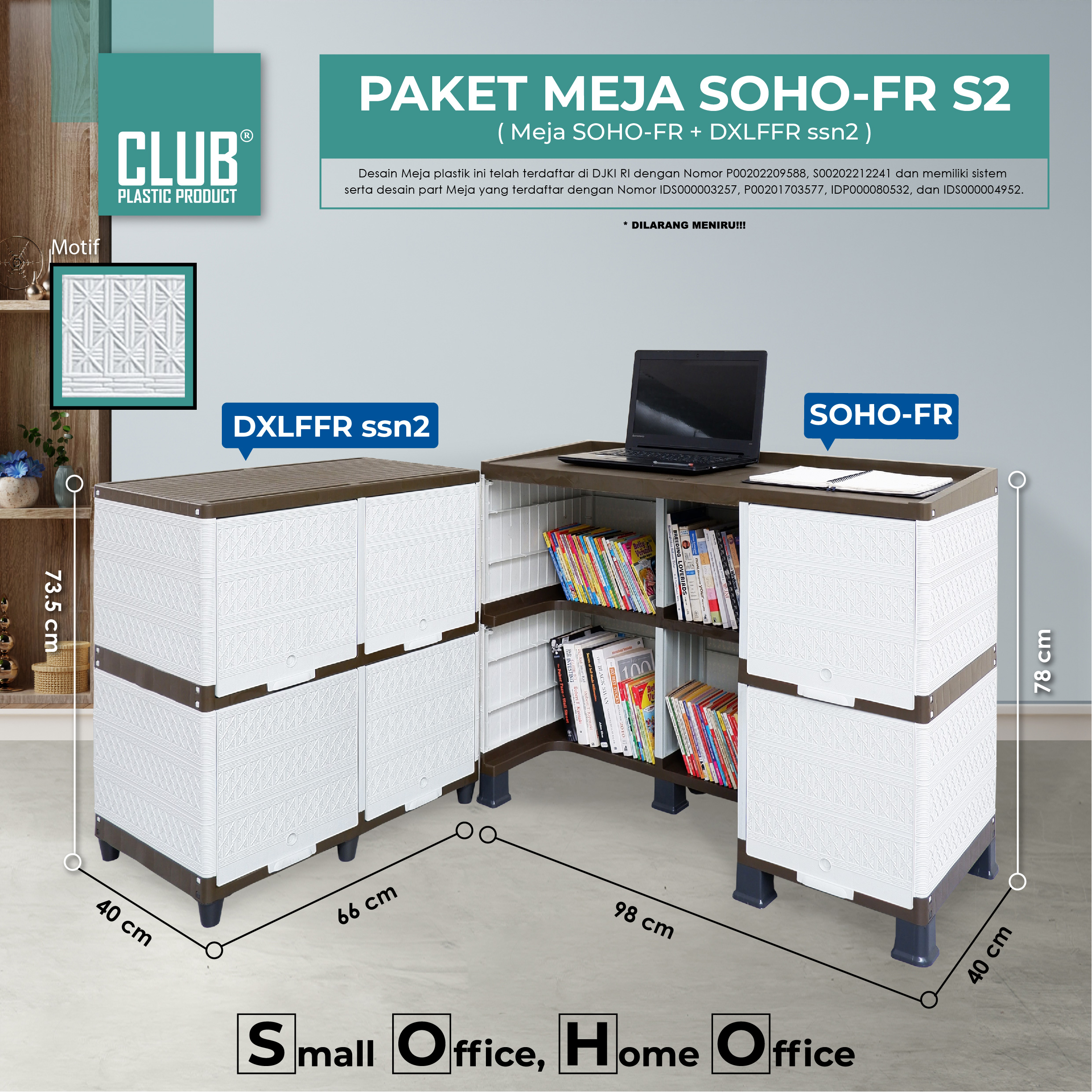 Paket Meja SOHO hadir untuk memenuhi segala kebutuhan home office Anda. Dengan ukurannya yang ringkas dan disertai sentuhan desain minimalis, Paket Meja SOHO tidak memakan banyak ruang dan dapat membantu Anda lebih produktif dalam melakukan pekerjaan. Paket Meja SOHO diproduksi dengan build quality yang tinggi, sehingga kokoh dan kuat menampung beban yang berat.