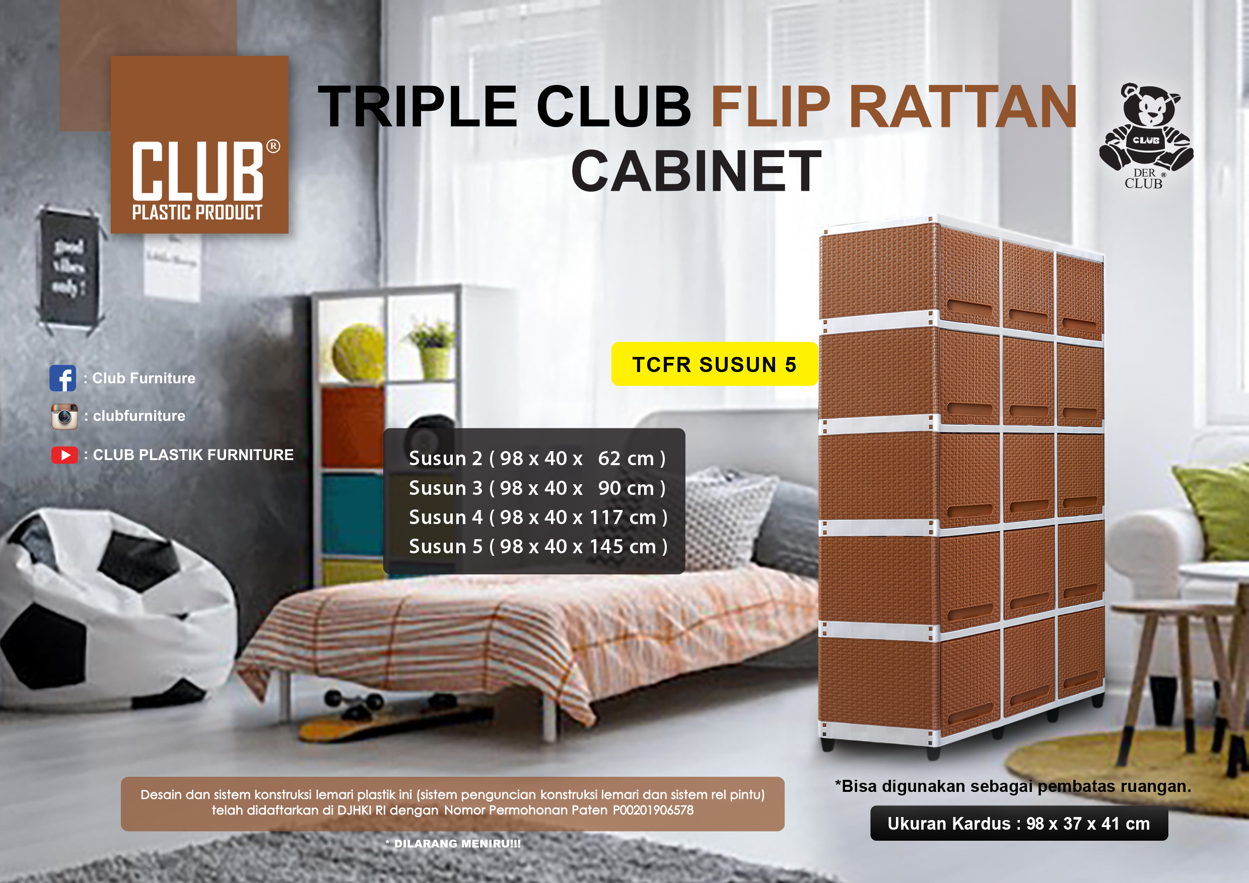 Desain dan sistem konstruksi lemari plastik ini telah didaftarkan di DJHKI RI dengan nomor permohonan patent sebagai berikut: