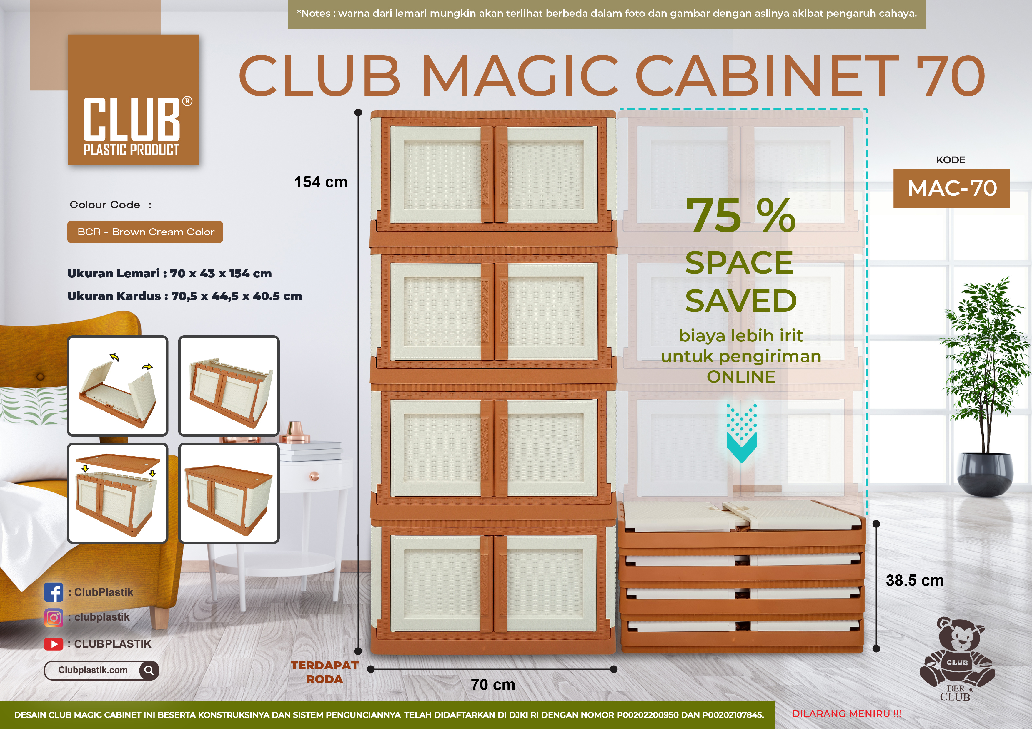 CLUB Magic Cabinet merupakan lemari portable yang hadir dengan sangat praktis serta multifungsi. CLUB Magic Cabinet dapat dilipat dan dikunci sehingga mudah untuk disimpan saat sedang tidak digunakan. Bersifat stackable (dapat ditumpuk) dan terdapat juga roda yang kuat di bagian bawahnya agar mudah dipindah-pindahkan. Diproduksi dengan bahan plastik berkualitas premium, CLUB Magic Cabinet dijamin tidak mudah rusak dan pecah.