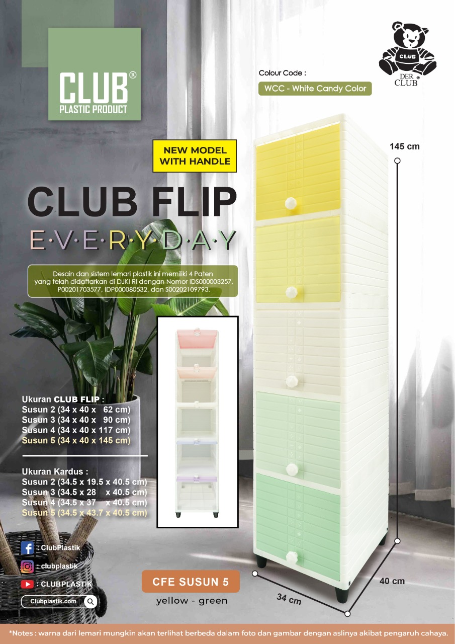 Berfungsi sangat baik untuk menyimpan barang-barang kesayangan anda, seperti pakaian, perlengkapan dapur, buku, mainan anak, dan lain-lain sesuai kebutuhan anda. Dengan ukuran yang ringkas dan compact, CLUB Flip sangatlah cocok untuk ditempatkan di rumah, apartemen, maupun kosan anda.